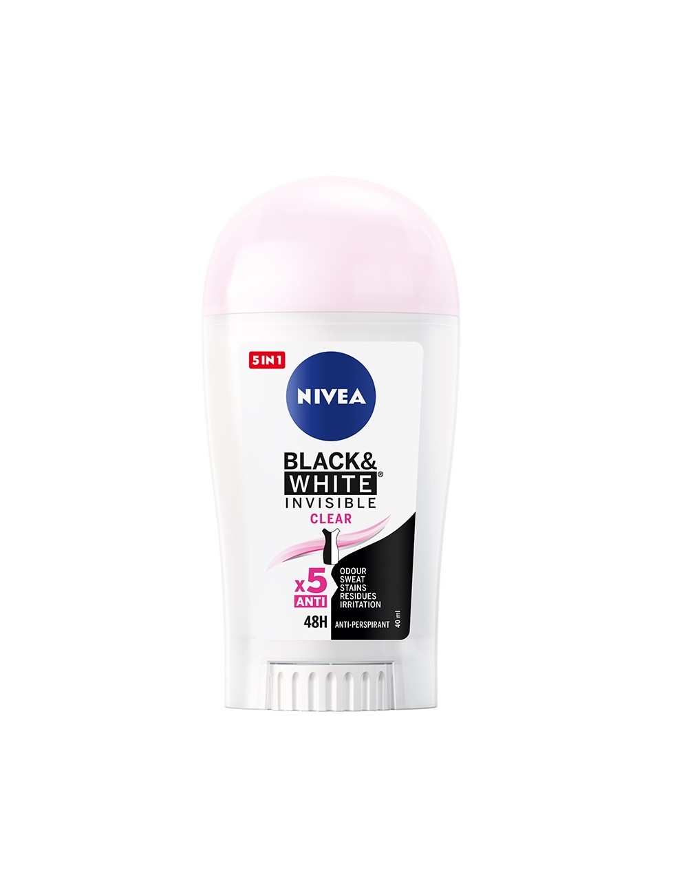 NIVEA Black&White Invisible Clear Antyperspirant to produkt, który zapewni Ci skuteczną i niezawodną ochronę przed poceniem się, bez ryzyka pobrudzenia Twoich ulubionych ubrań. Zapewnia ochronę 5w1 i chroni przed nieprzyjemnym zapachem, poceniem, żółtymi plamami, białymi śladami oraz przed podrażnieniami. Antyperspirant nie pozostawia żółtych plam na białych ubraniach ani białych śladów na czarnych. Unikalna formuła chroni Cię przed nadmiernym poceniem się przez 48 godzin, jednocześnie pielęgnując Twoją skórę. Delikatny i kobiecy zapach zapewnia uczucie świeżości. Jego łagodność dla skóry została potwierdzona dermatologicznie.