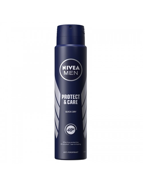 NIVEA Men Protect & Care Antyperspirant w sprayu zawiera składniki oraz zapach Kremu NIVEA, dzięki czemu łagodnie pielęgnuje skórę pod pachami, a jednocześnie zapewnia wysoce efektywną ochronę przed poceniem. To idealne połączenie skuteczności i pielęgnacji sprawia, że możesz czuć się pewnie przez cały dzień. Antyperspirant będzie zapobiegać nadmiernemu poceniu się nawet przez 48 godzin, zapewniając Ci przyjemny, męski zapach NIVEA. Produkt nie zawiera alkoholu i jest dostępny również w kulce i w sztyfcie. Formuła nie zawiera alkoholu etylowego. Tolerancja dla skóry potwierdzona dermatologicznie.