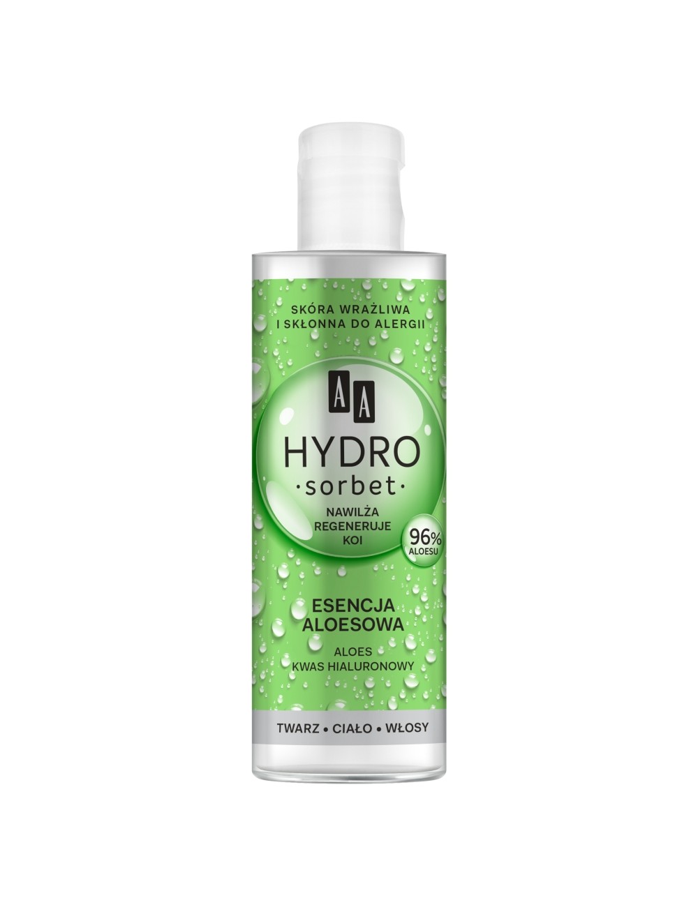 Odkryj moc nawilżenia w linii AA Hydro Sorbet. Lekkie formuły szybko się wchłaniają, pozostawiając skórę miękką, intensywnie nawilżona i jedwabiście gładka. Esencja Aloesowa 96% z ekstraktem z liści aloesu i kwasem hialuronowym idealnie nawilża nie tylko skórę twarzy i ciała, ale także doskonale odżywia i poprawia kondycje włosów. Dzięki żelowej formule, nie pozostawia na skórze uczucia lepkości. Skóra jest nawilżona, odżywiona i wygląda młodziej.