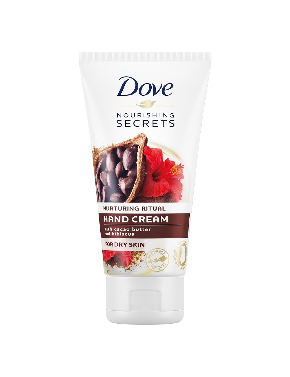 Krem do rąk Dove Nourishing Secrets Nurturing Ritual oferuje odpowiednią pielęgnację Twoim dłoniom. Odkryj tajemnicę piękna kobiet pochodzących z Ghany, które w codziennych rytuałach wykorzystują ziarna kakaowca i kwiat hibiskusa.