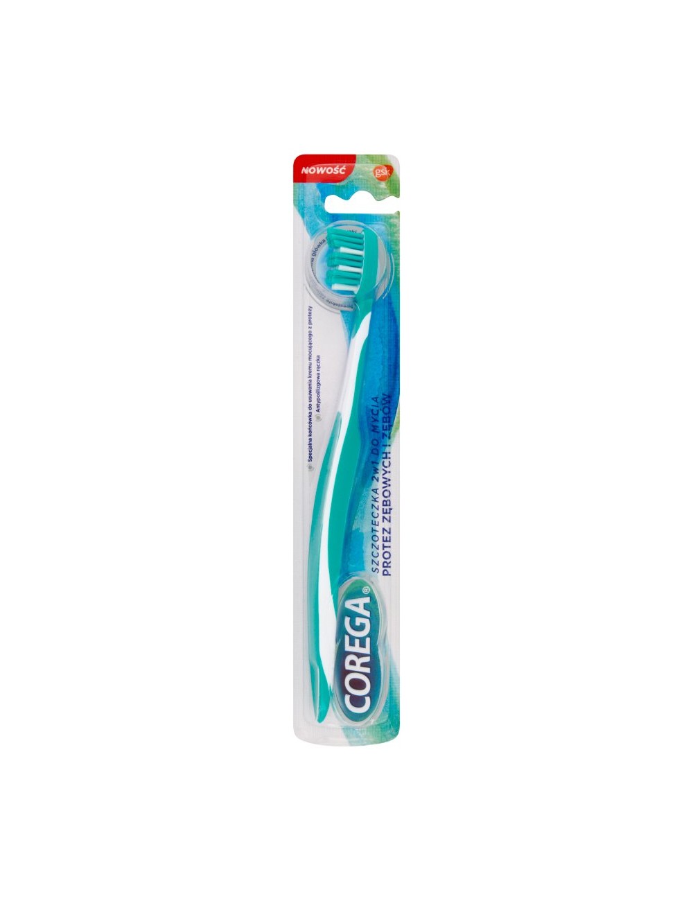 The Corega 2in1 brush has been designed to thoroughly clean both dentures and teeth.