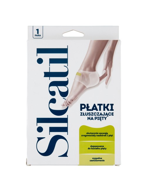 Silcatil płatki złuszczające na pięty nasączone są formułą aktywną, w skład której wchodzą 3 hydrokwasy: glikolowy, mlekowy i salicylowy. Dzięki ich silnym właściwościom keratolitycznym skutecznie złuszczają obumarły naskórek, usuwając wszelkie zrogowacenia, odciski i zgrubienia. Efekty działania płatków widoczne są już kilka dni po zastosowaniu. Silcatil intensywnie pielęgnuje skórę pięt, sprawiając, że staje się gładka, miękka i nawilżona.