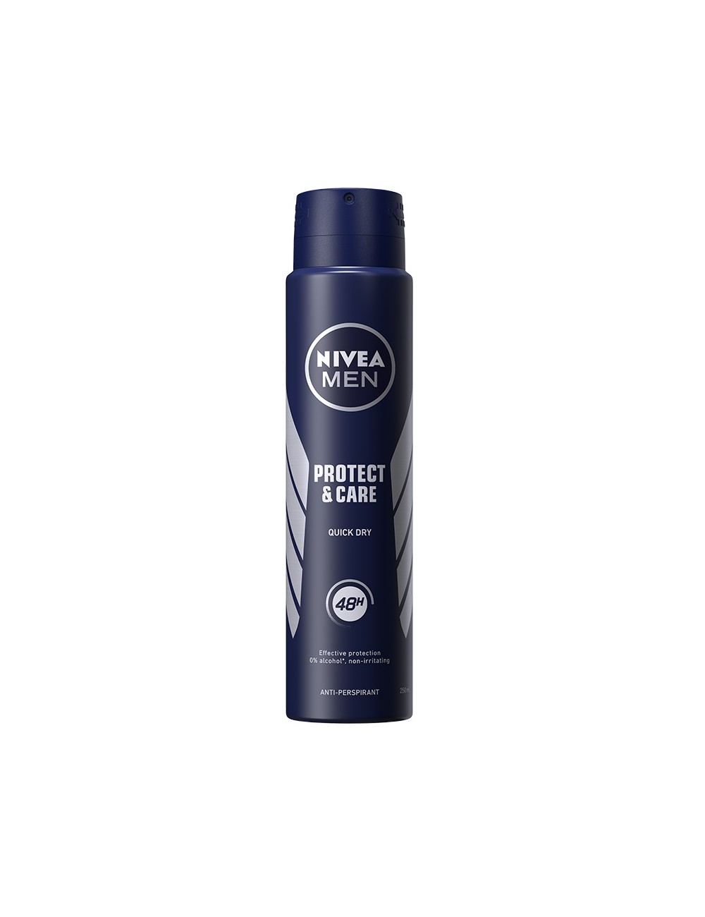 NIVEA Men Protect & Care Antyperspirant w sprayu zawiera składniki oraz zapach Kremu NIVEA, dzięki czemu łagodnie pielęgnuje skórę pod pachami, a jednocześnie zapewnia wysoce efektywną ochronę przed poceniem. To idealne połączenie skuteczności i pielęgnacji sprawia, że możesz czuć się pewnie przez cały dzień. Antyperspirant będzie zapobiegać nadmiernemu poceniu się nawet przez 48 godzin, zapewniając Ci przyjemny, męski zapach NIVEA. Produkt nie zawiera alkoholu i jest dostępny również w kulce i w sztyfcie. Formuła nie zawiera alkoholu etylowego. Tolerancja dla skóry potwierdzona dermatologicznie.