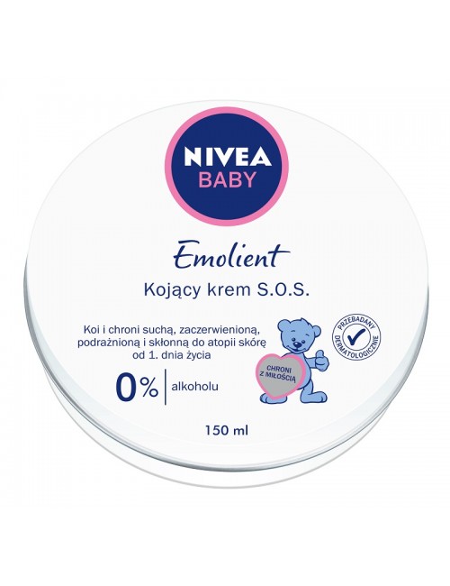 Poznaj NIVEA BABY Emolient Kojący krem S.O.S do skóry suchej, zaczerwienionej, skłonnej do atopii. Od 1.dnia życia. Dzięki formule z masłem shea, lipidami Omega 6 i pantenolem przynosi natychmiastową ulgę. Intensywnie odżywia skórę. Zapobiega wysuszeniu skóry pozostawiając na niej film ochronny. Zapobiega swędzeniu, podrażnieniom i zaczerwienieniu skóry zapewniając uczucie komfortu skóry. Łatwo się rozprowadza. Chroni przed otarciami. Formuła stworzona tak, aby zapewnić wysoką tolerancję dla delikatnej i wrażliwej skóry niemowląt i dzieci.