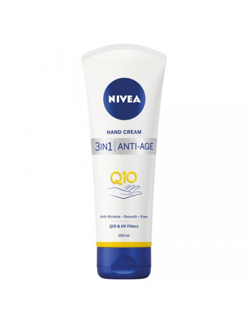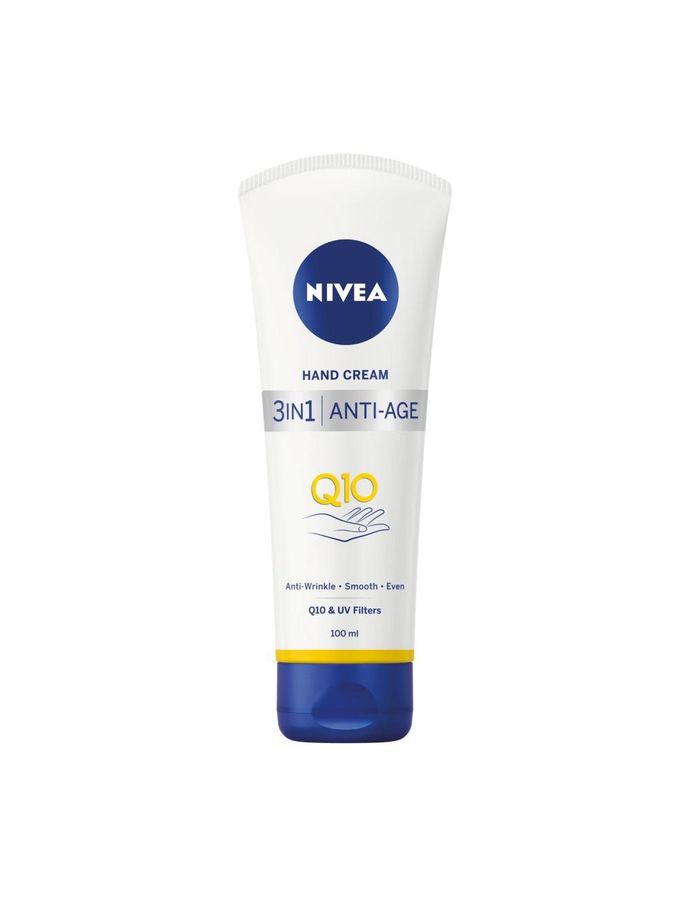 NIVEA Anti-Age Care 3in1 Anti-Age Care Hand Cream with Q10 complex and UV filters: helps to reduce the appearance of wrinkles, smoothes and evens out the skin texture. The formula has been tested and its effectiveness has been proven in research. 24-hour protection for normal to dry hand skin.