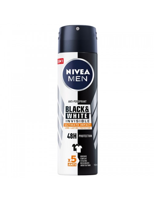 NIVEA MEN Antyperspirant Black & White Invisible Ultimate Protect to produkt opracowany we współpracy z ekspertami z dziedziny tekstyliów, by zapewnić Ci mocną i niezawodną ochronę przed poceniem się, bez ryzyka pobrudzenia ubrań. Antyperspirant ma nowy, świeży zapach, który zapewnia długotrwałe uczucie świeżości i czystości. Nie pozostawia żółtych plam na czarnych ubraniach ani białych śladów na czarnych ubraniach. Nie zawiera alkoholu etylowego, a jego łagodność dla skóry została potwierdzona dermatologicznie. Wygodna forma aplikacji w sprayu. Unikalna formuła chroni Cię przed nadmiernym poceniem się przez 48 godzin i pomaga zachować pierwotny kolor ubrań.