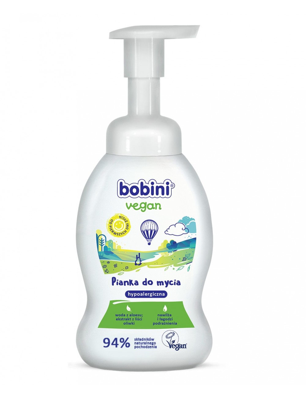 Bobini Vegan hypoalergiczna pianka do mycia rączek, buzi i ciała – tylko to, co najlepsze z natury dla naszych maluchów. Łagodna formuła oparta jest na substancjach myjących roślinnego pochodzenia, które zapewniają wrażliwej skórze optymalną pielęgnację. W połączeniu z naturalnymi składnikami nawilżającymi puszysta pianka delikatnie myje buźkę, ciało i rączki Twojego dziecka. Wygodna pompka sprawia, że na skórę malucha trafia idealna ilość produktu. Od 1-go dnia życia.