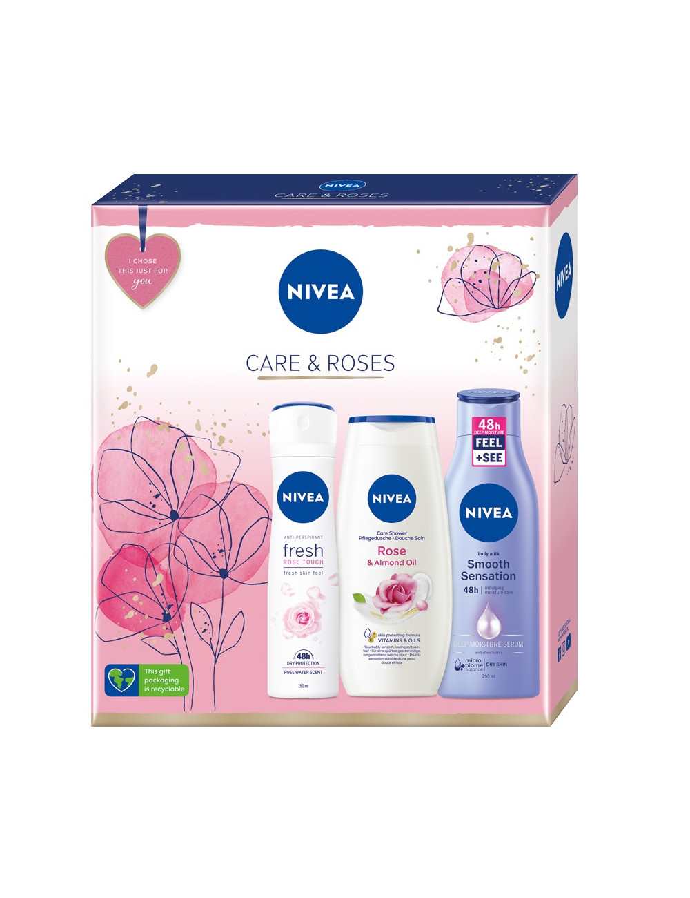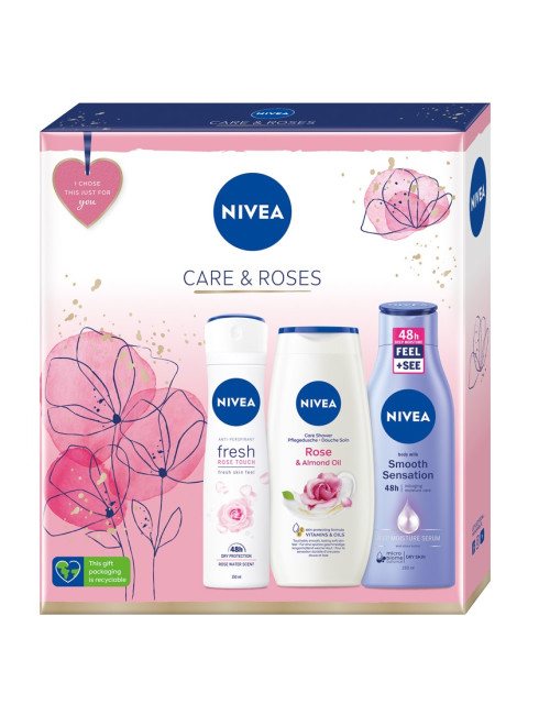 Szukasz zestawu kosmetyków na prezent? Odkryj NIVEA CARE & ROSES, zawierający produkty o wyjątkowych, różanych zapachach i pielęgnacyjnych formułach! Eleganckie opakowanie świetnie prezentuje się pod choinką.