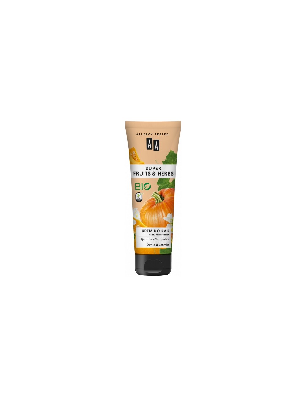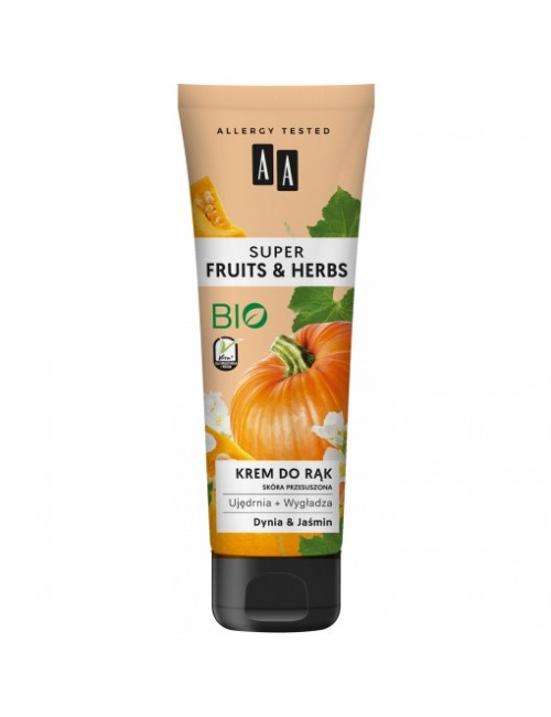 Odkryj niezwykłą moc naturalnej pielęgnacji z AA super FRUITS & HERBS! Unikalna kompozycja wyselekcjonowanych ekstraktów z superowoców i wyjątkowych ziół dostarczy skórze zastrzyk skoncentrowanych substancji odżywczych i witamin. Idealnie kremowe konsystencje i apetycznie soczyste zapachy otulą Cię, odprężając i wprawiając w doskonały nastrój. Sięgnij po wyjątkowy Krem do rąk z dynią i jaśminem, a Twoje dłonie odzyskają elastyczność i staną się aksamitnie gładkie.
